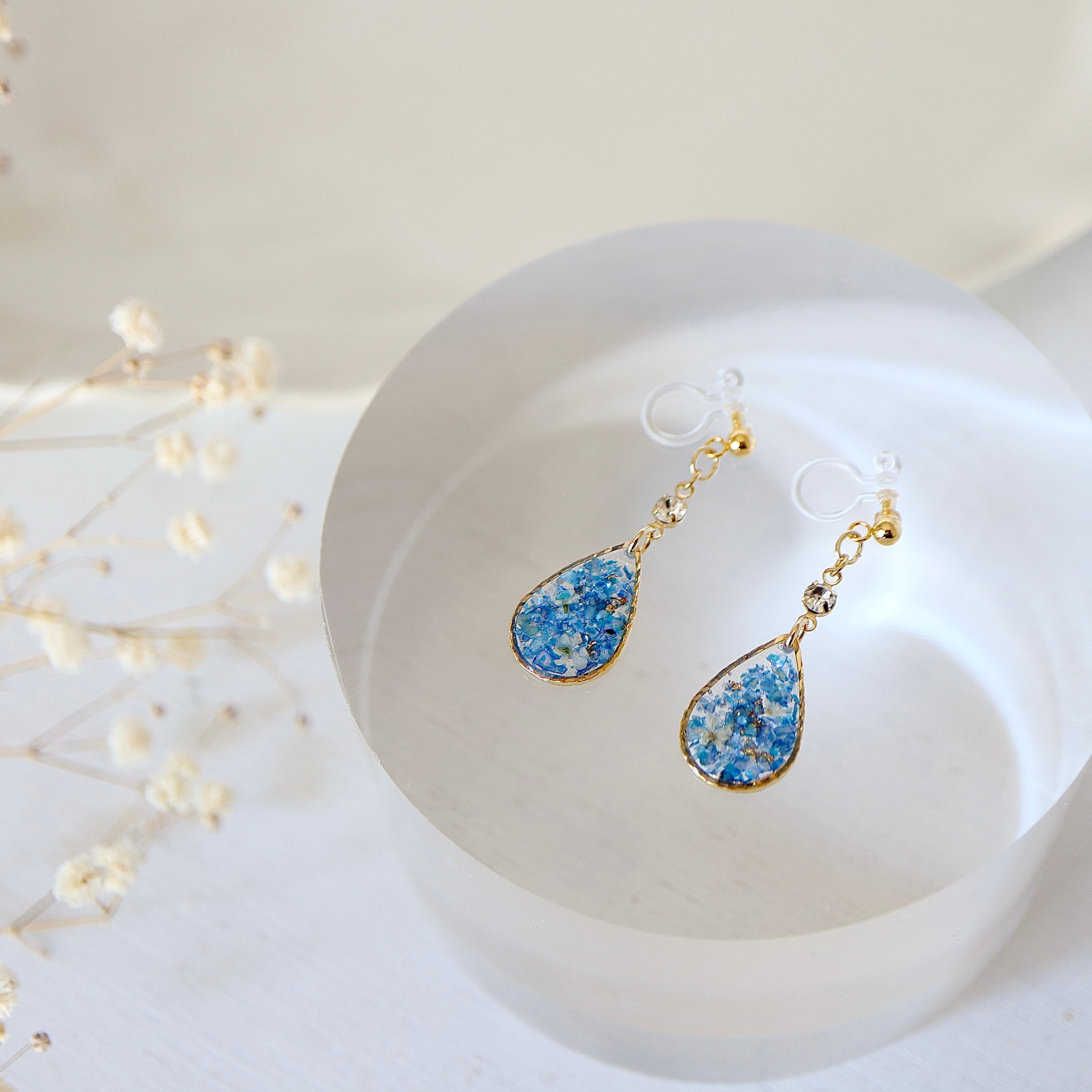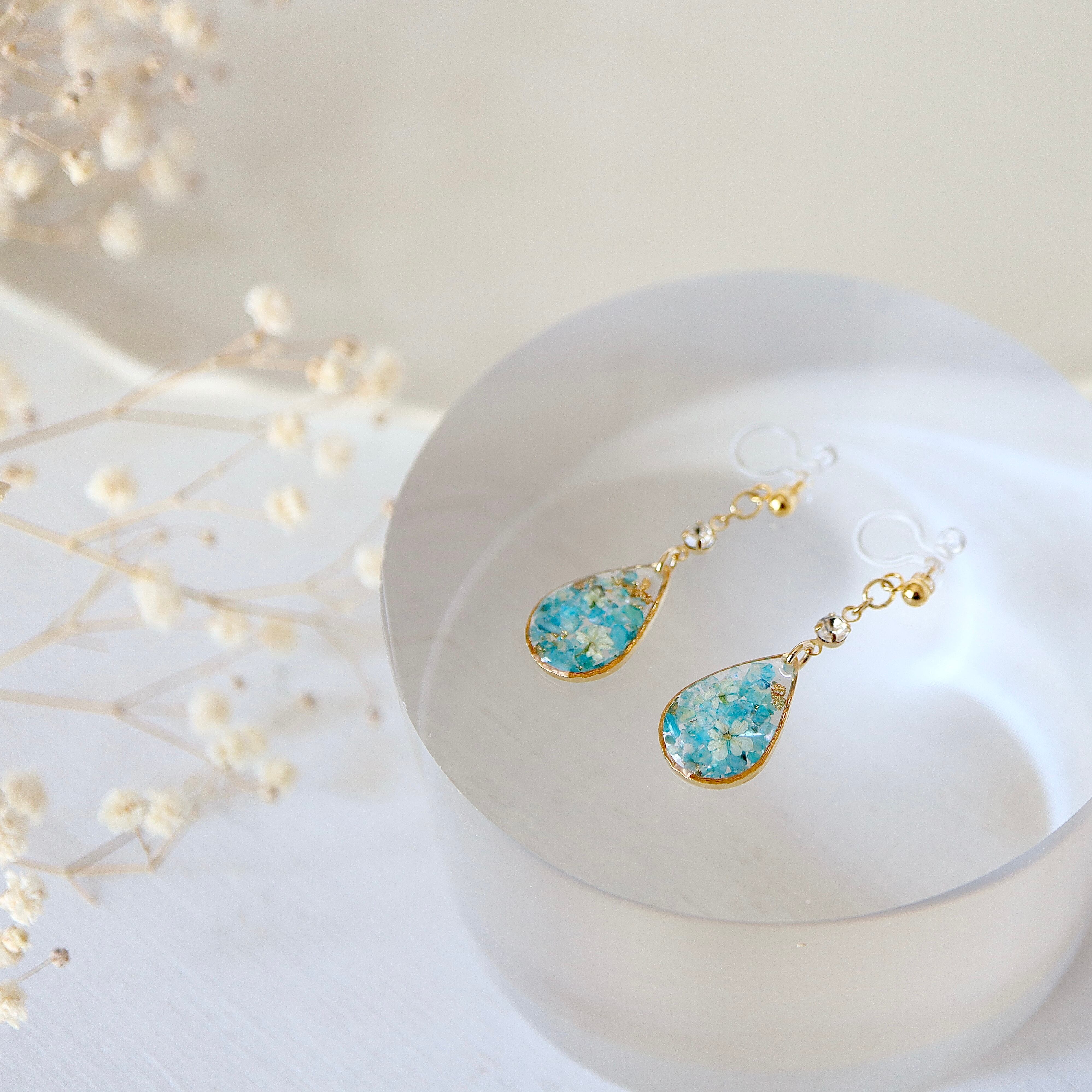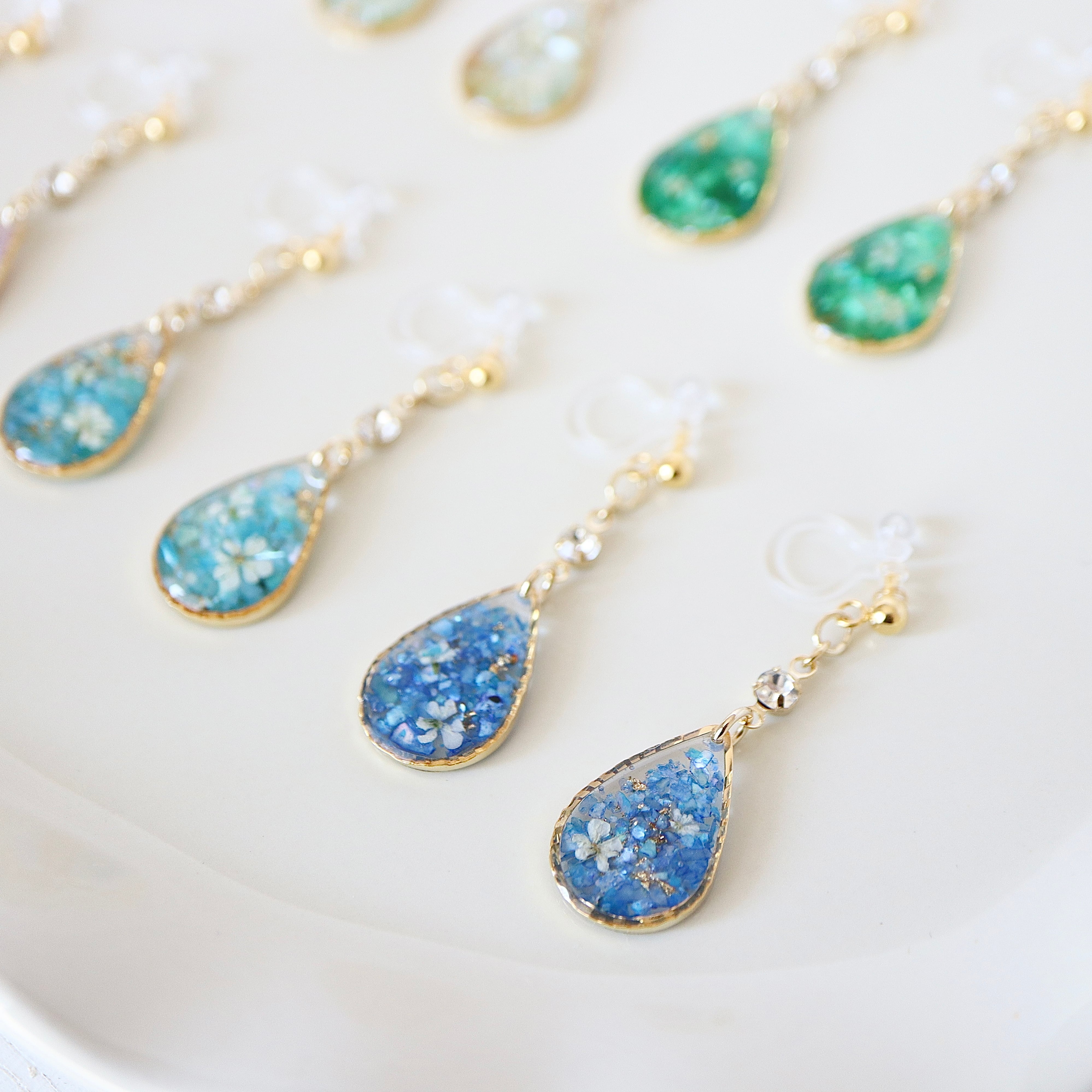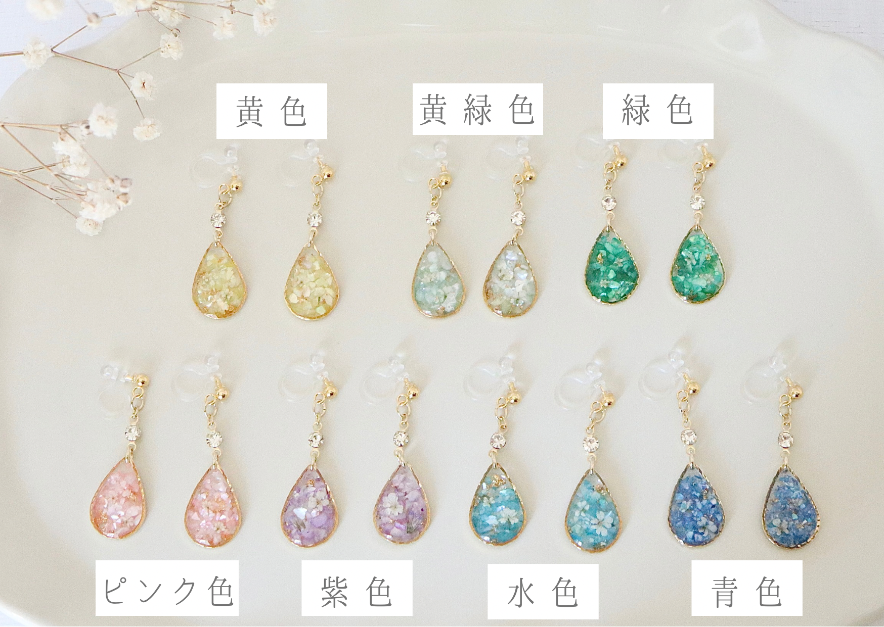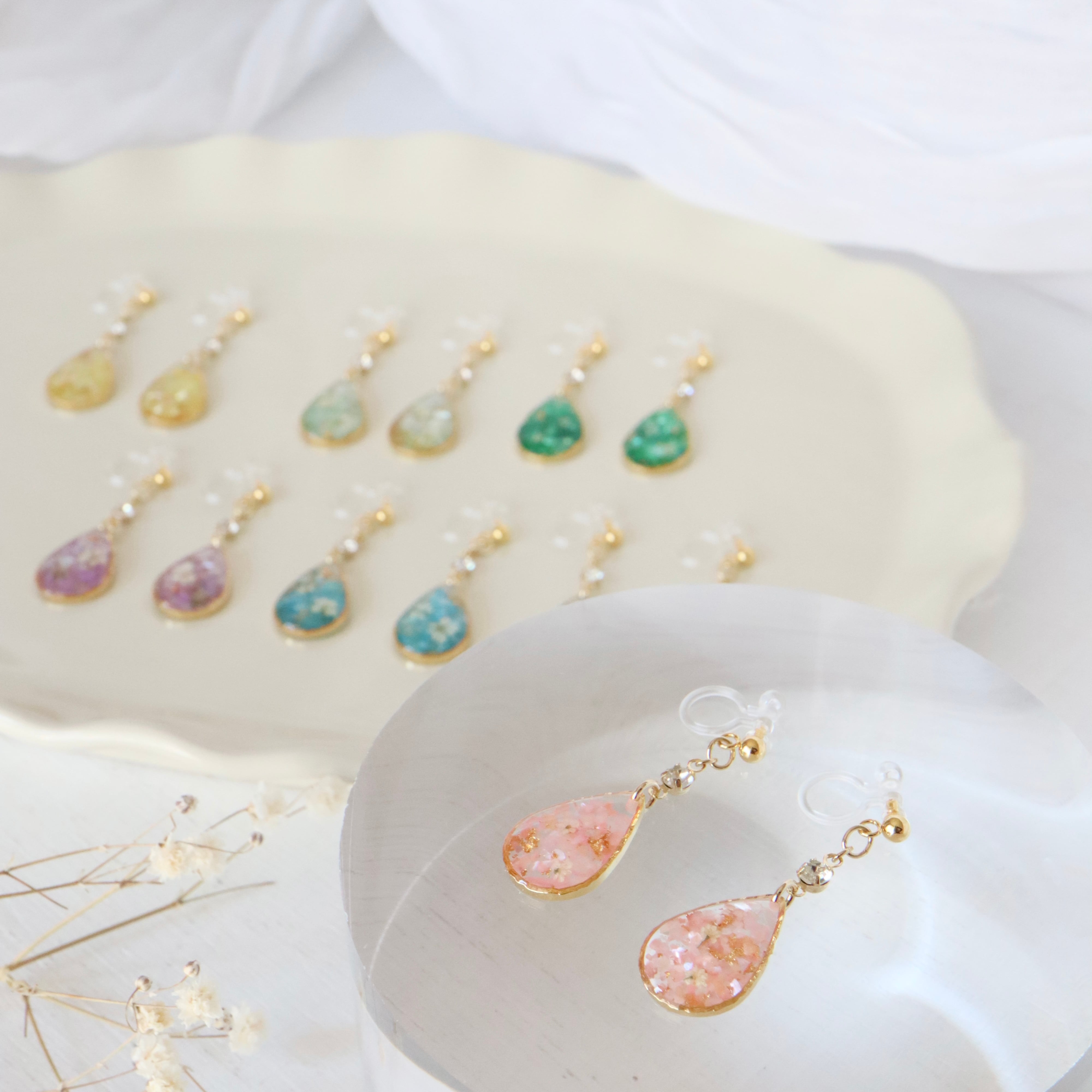 色とりどりの雫の中に、小さな本物のお花をとじこめました。