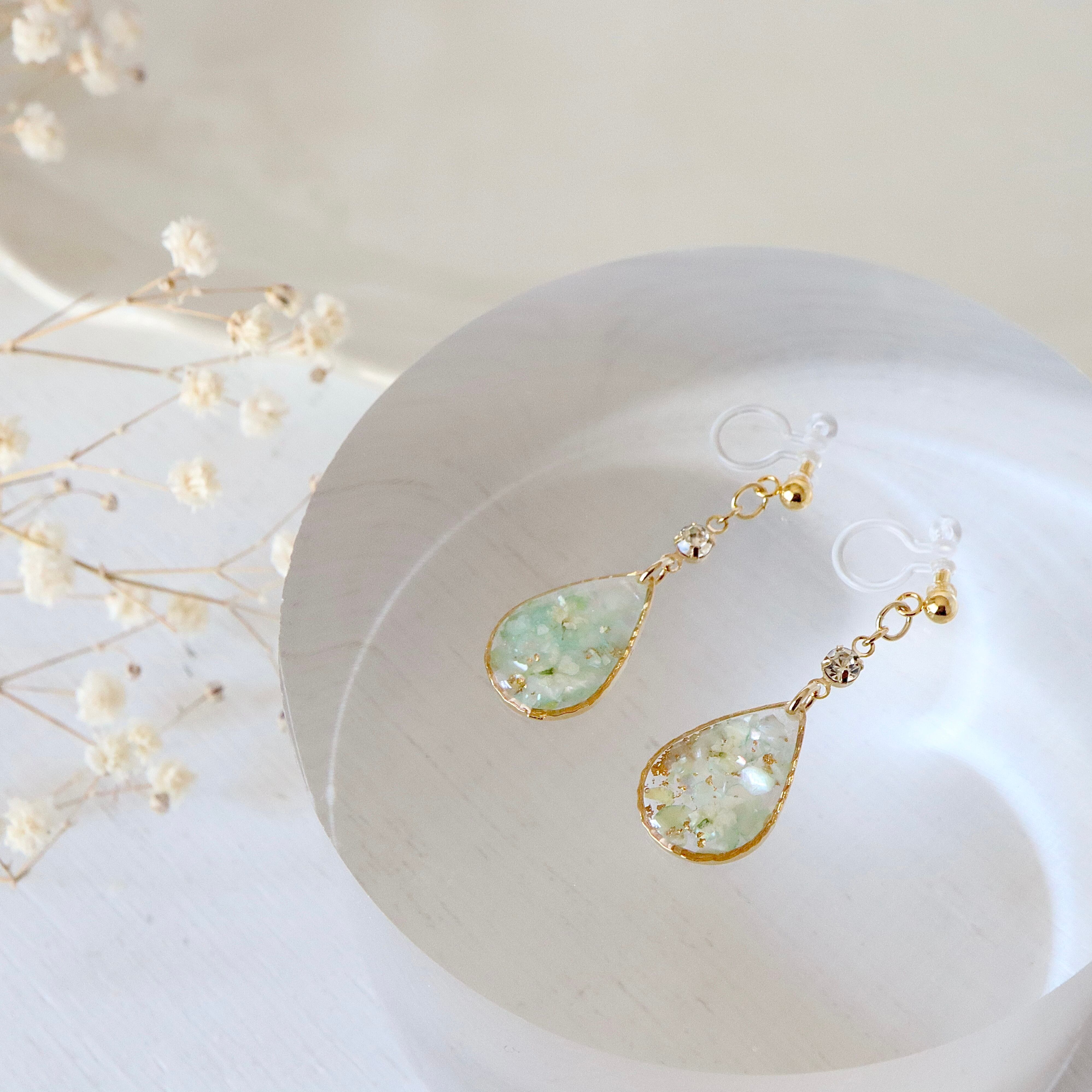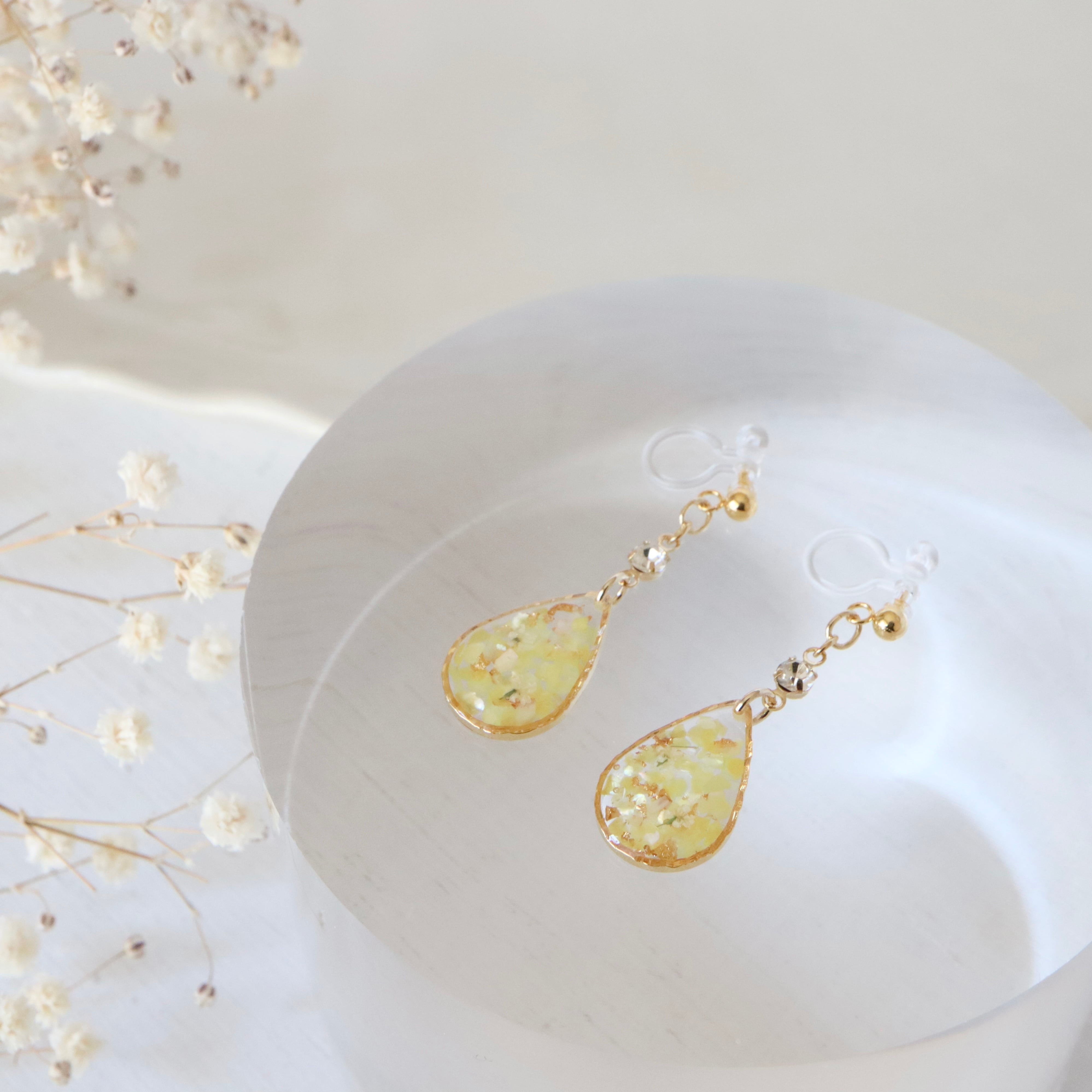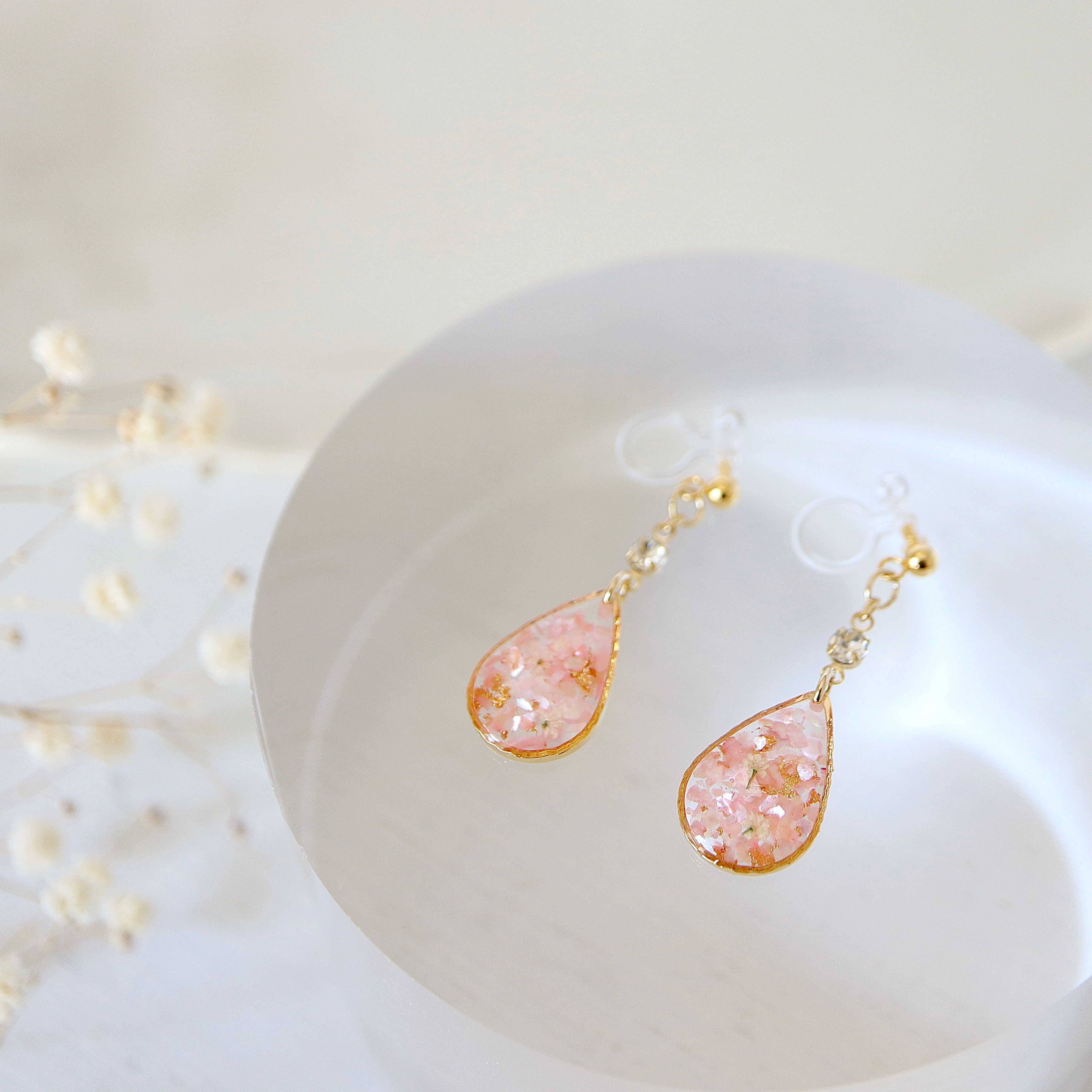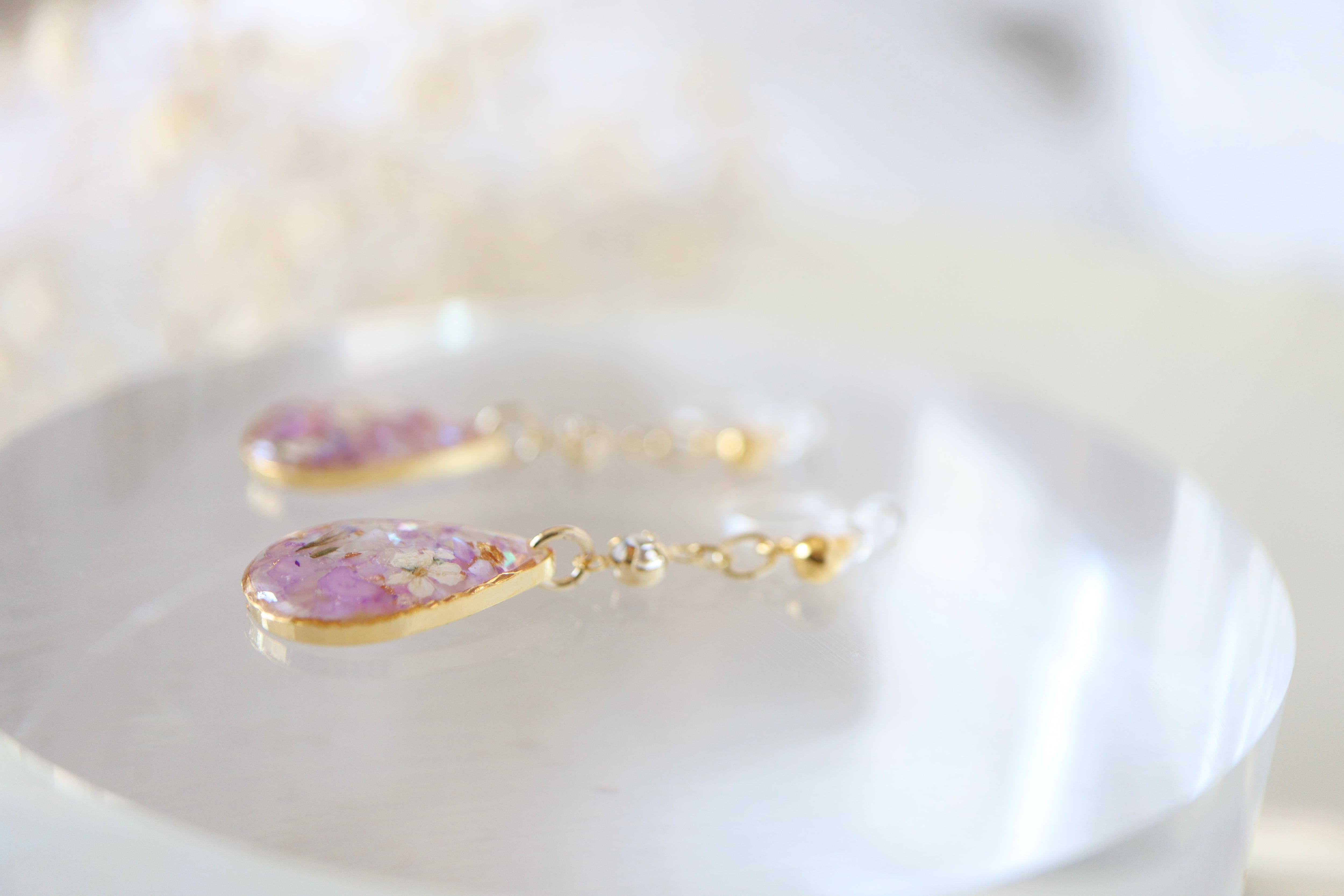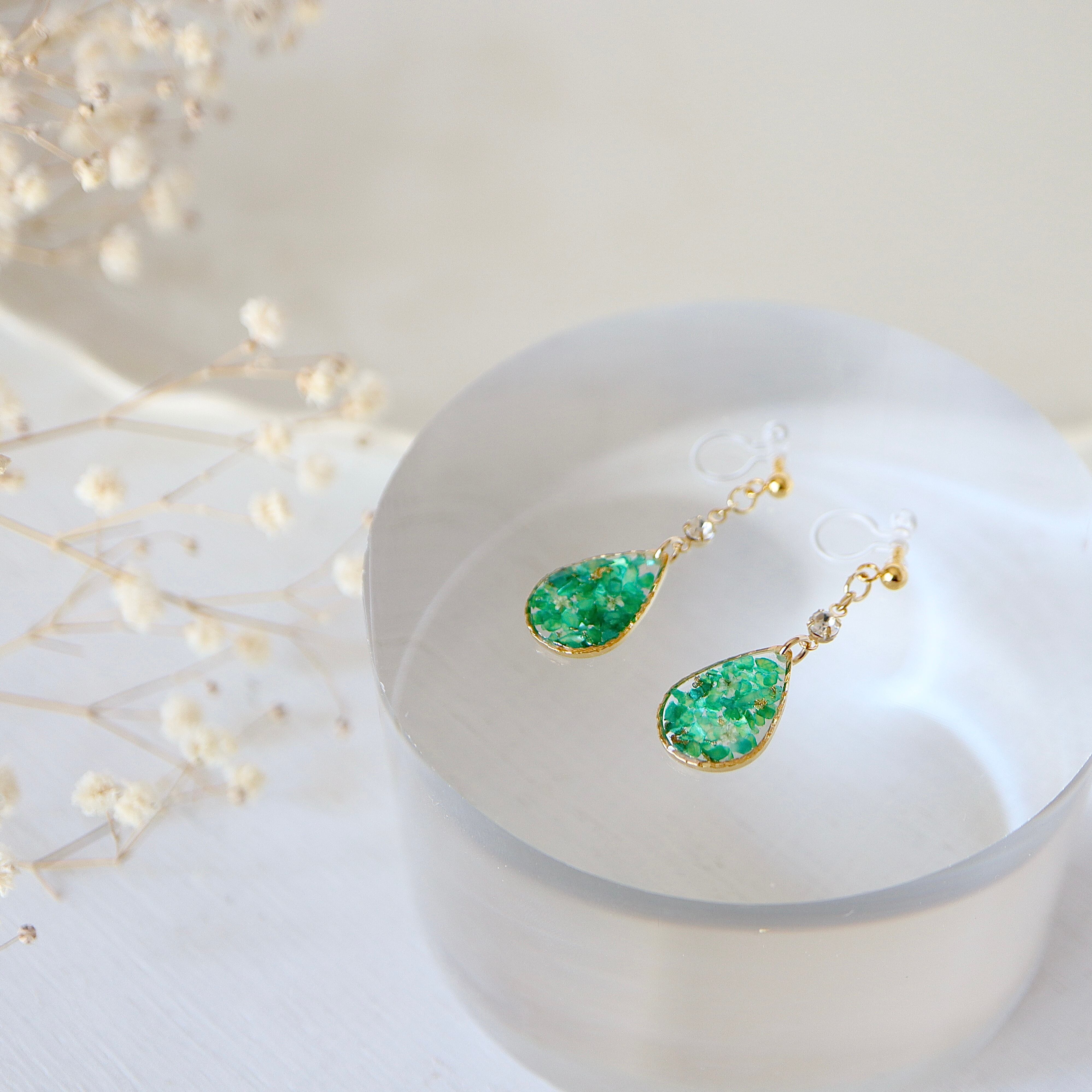 色とりどりの雫の中に、小さな本物のお花をとじこめました。
