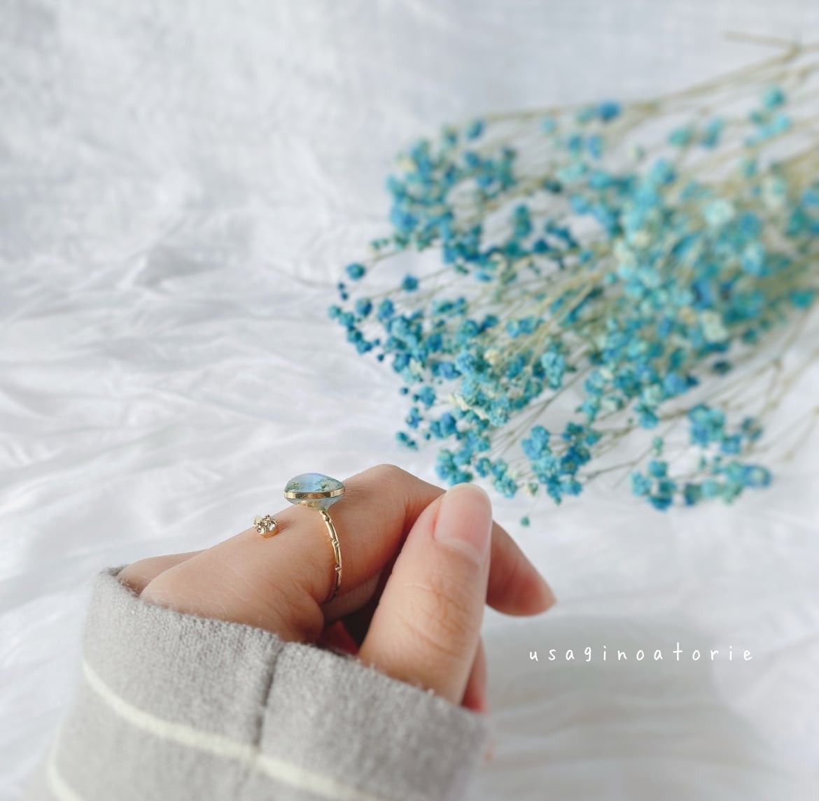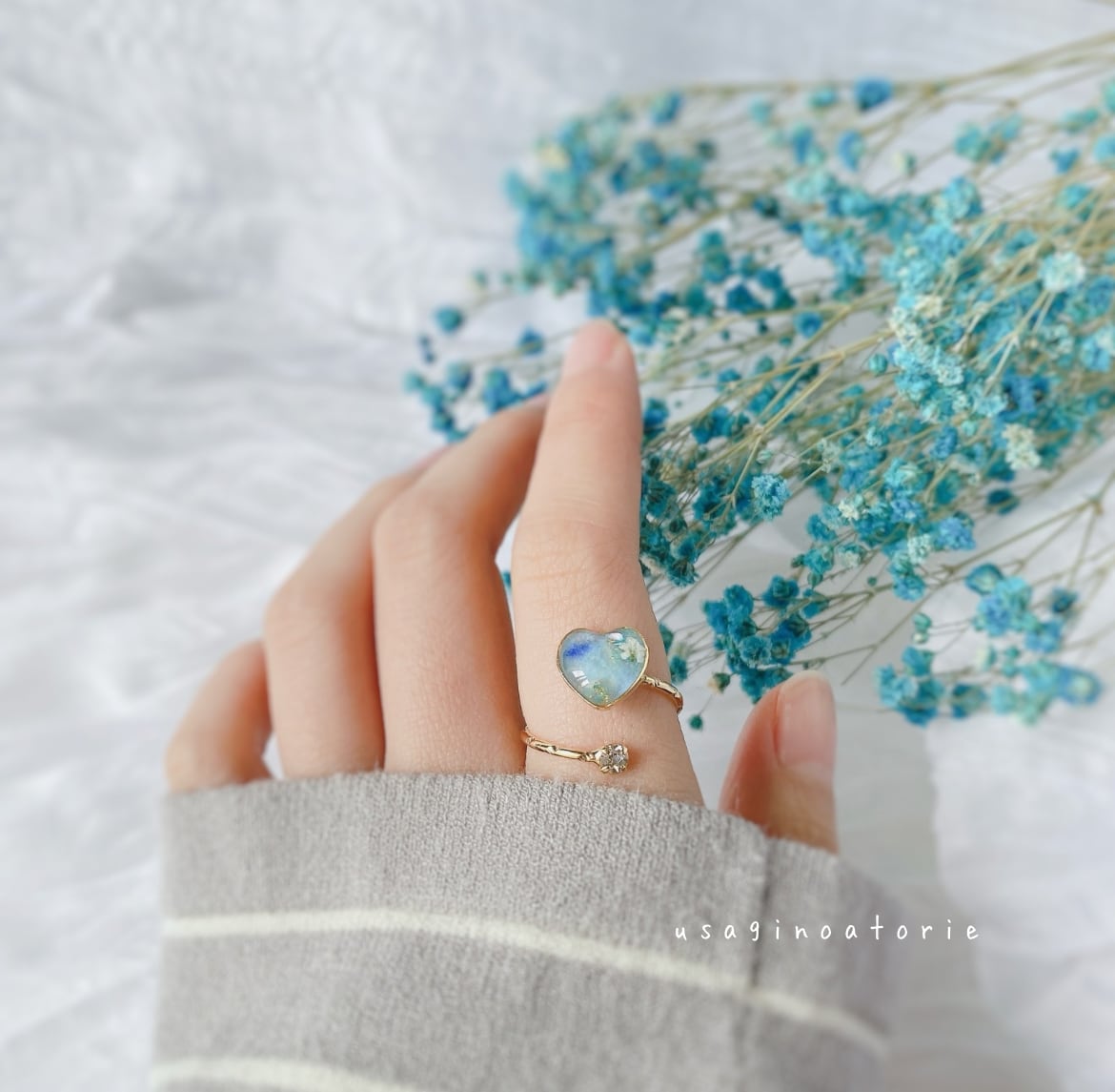 ▢ 水彩和紙シリーズのリングは、レジン液を通常よりも何層も重ねて仕上げているため、ぷっくりとした厚みがございます。
