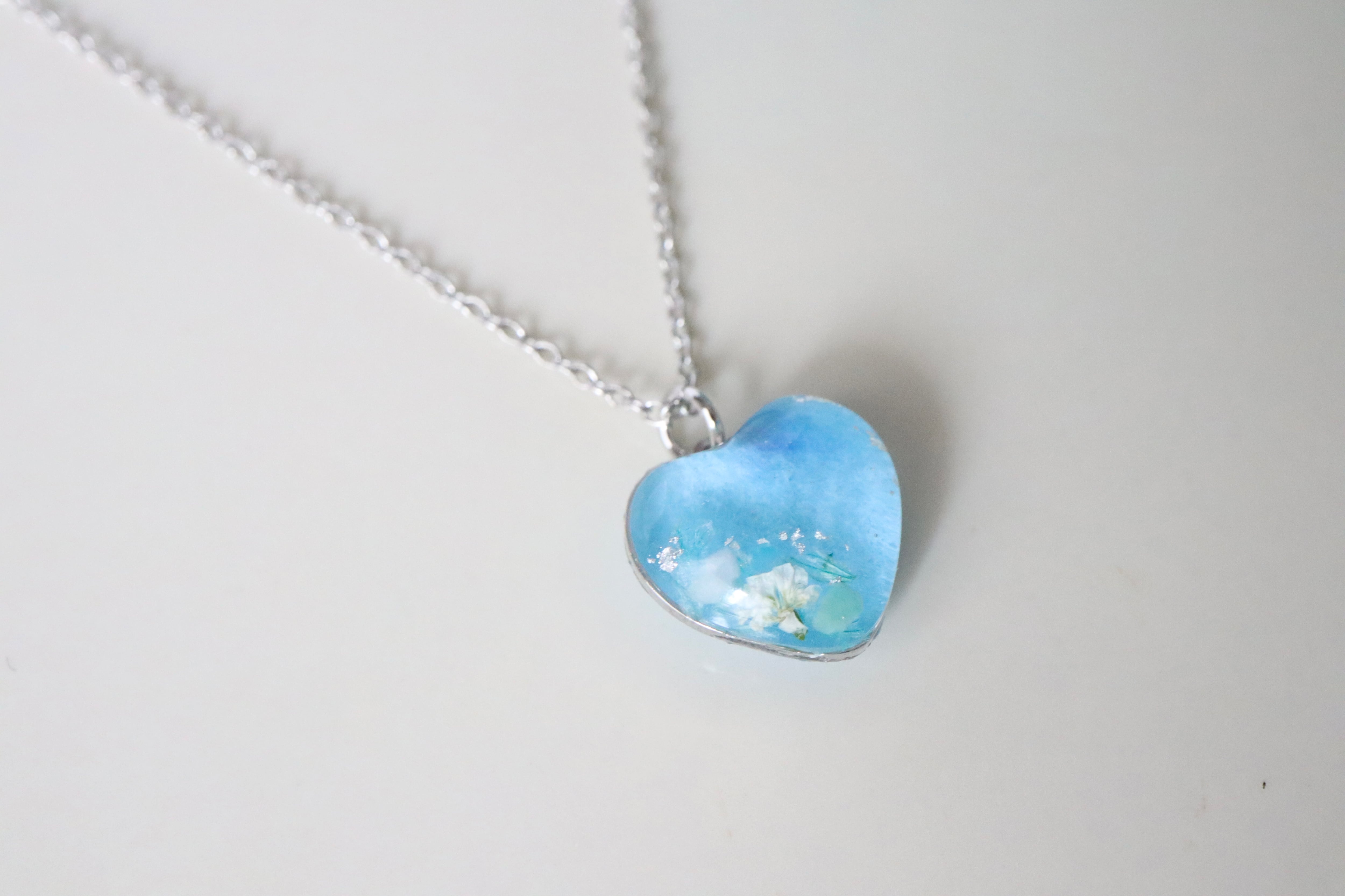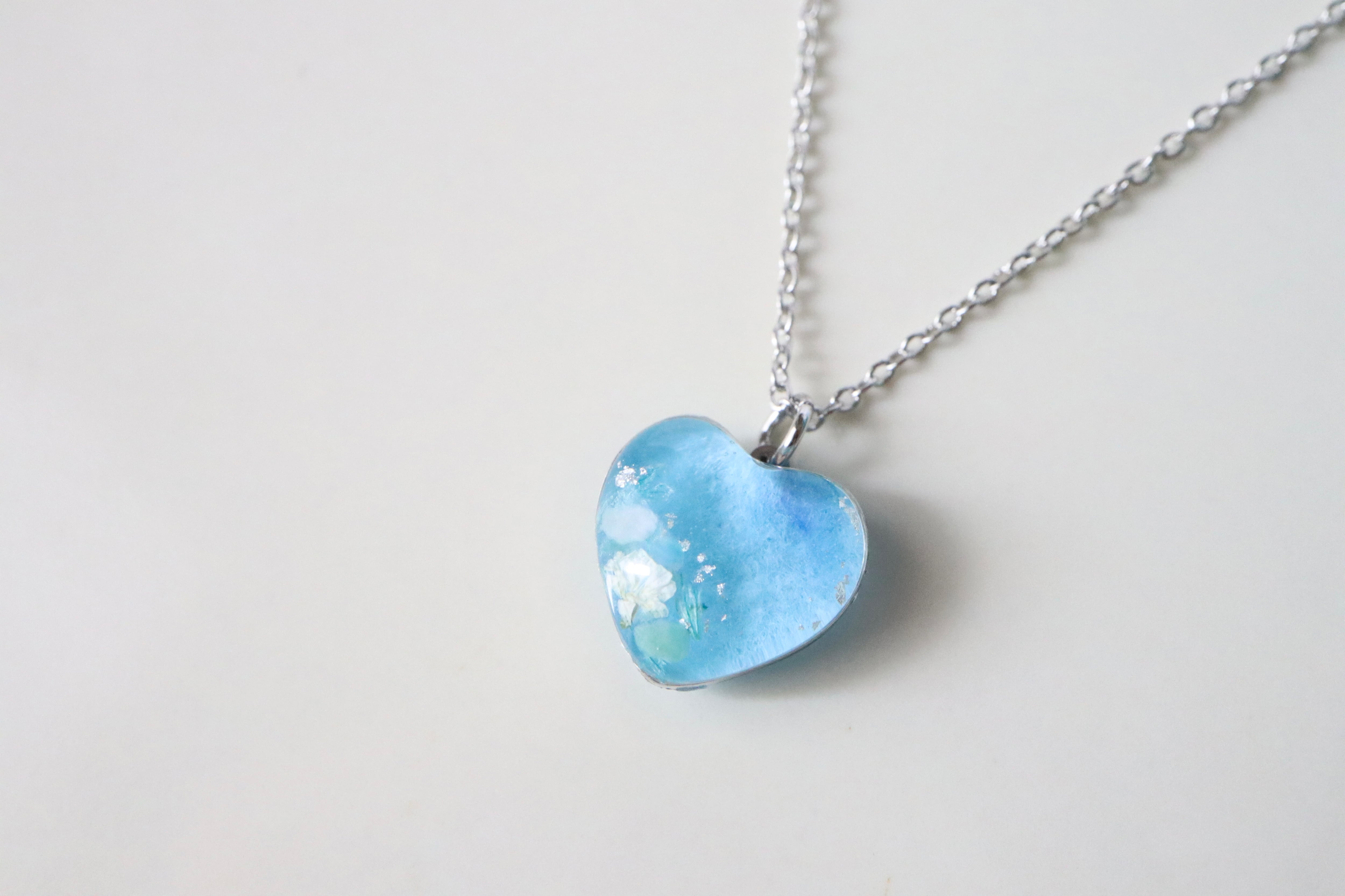本物のお花や貝殻をとじ込めた、同じものはつくれない一点ものの、小さな青のかけら。