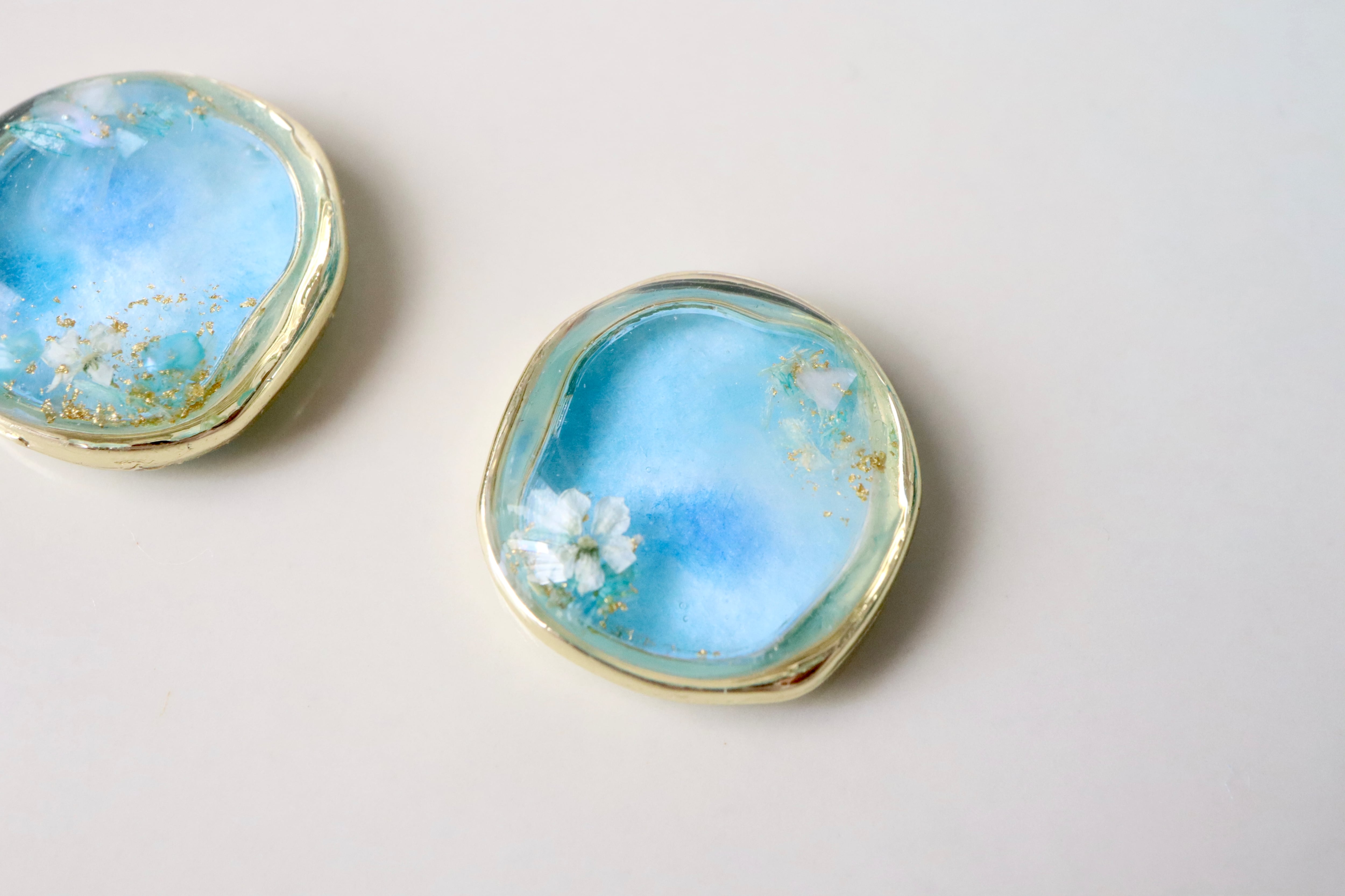 本物のお花や貝殻をとじ込めた、同じものは作れない一点ものの、小さな青のかけら。