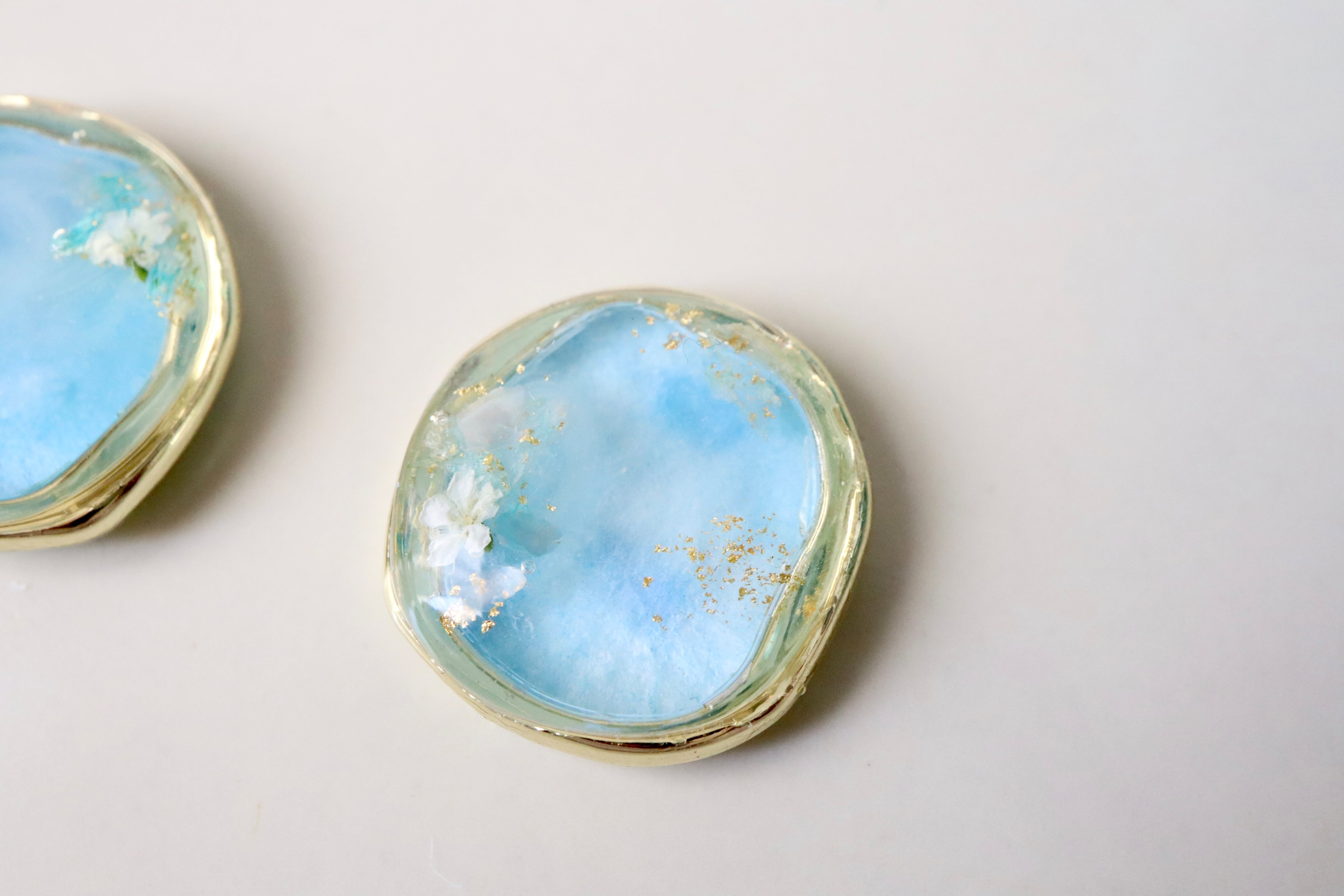 本物のお花や貝殻をとじ込めた、同じものは作れない一点ものの、小さな青のかけら。