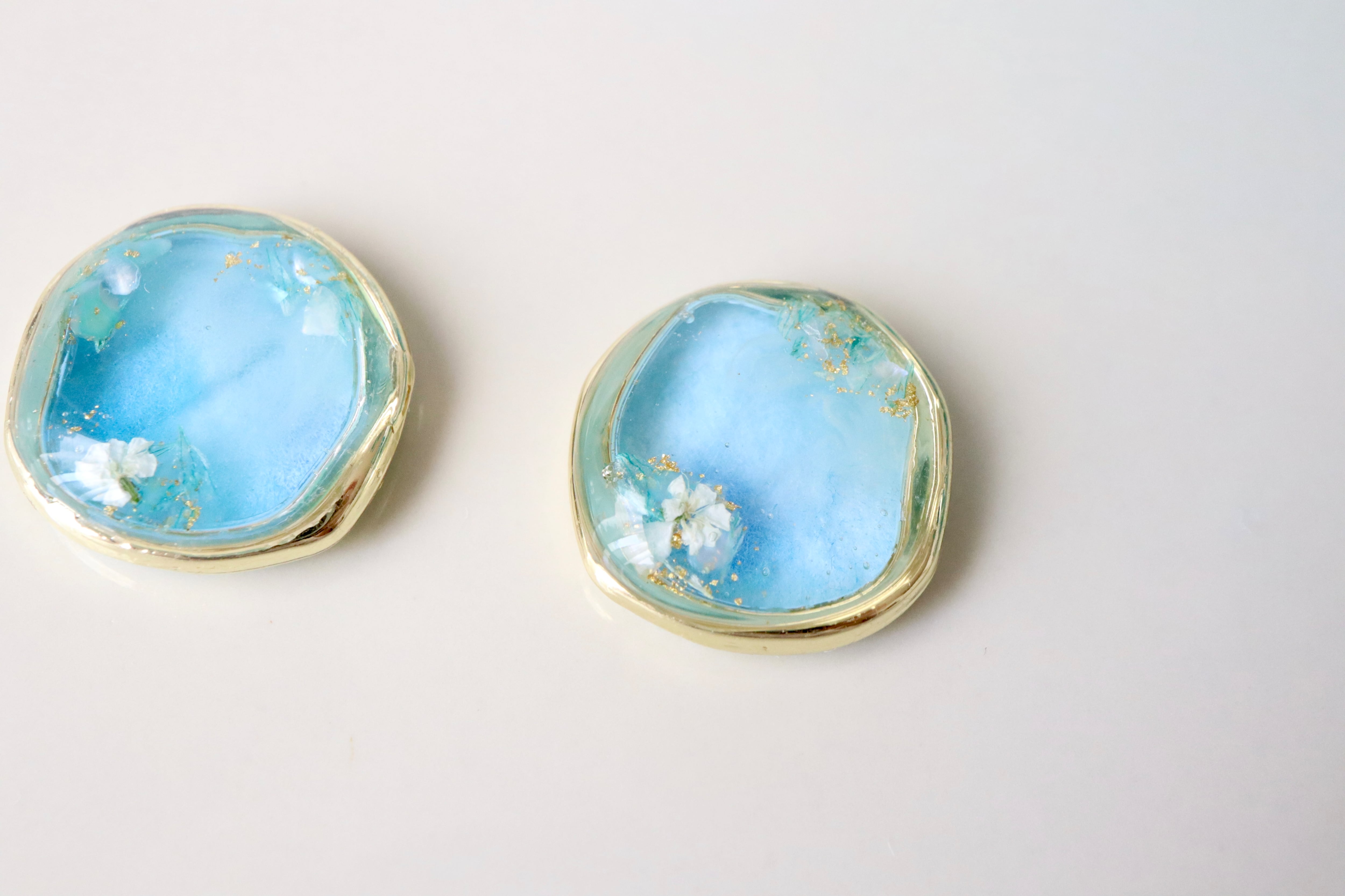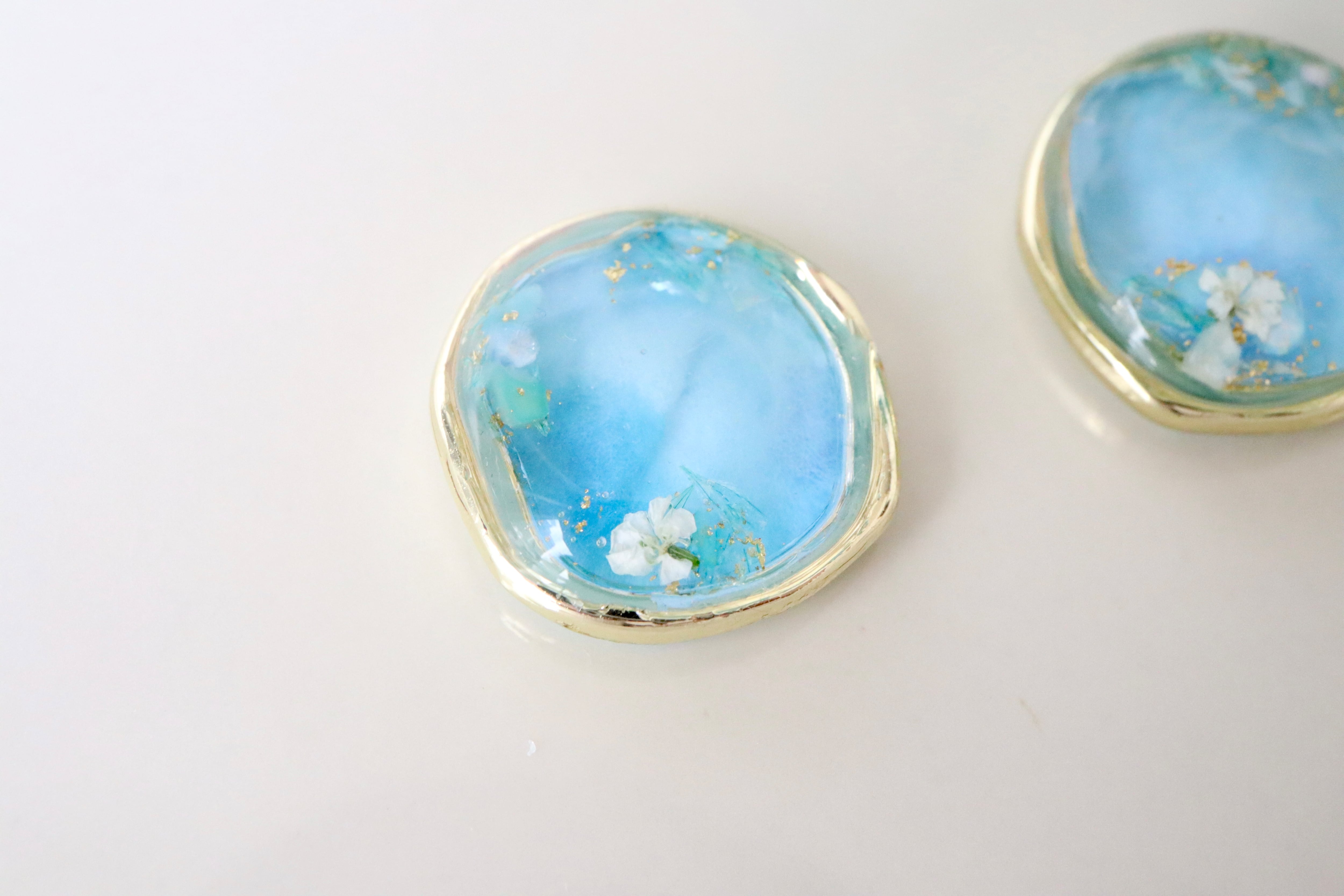 本物のお花や貝殻をとじ込めた、同じものは作れない一点ものの、小さな青のかけら。