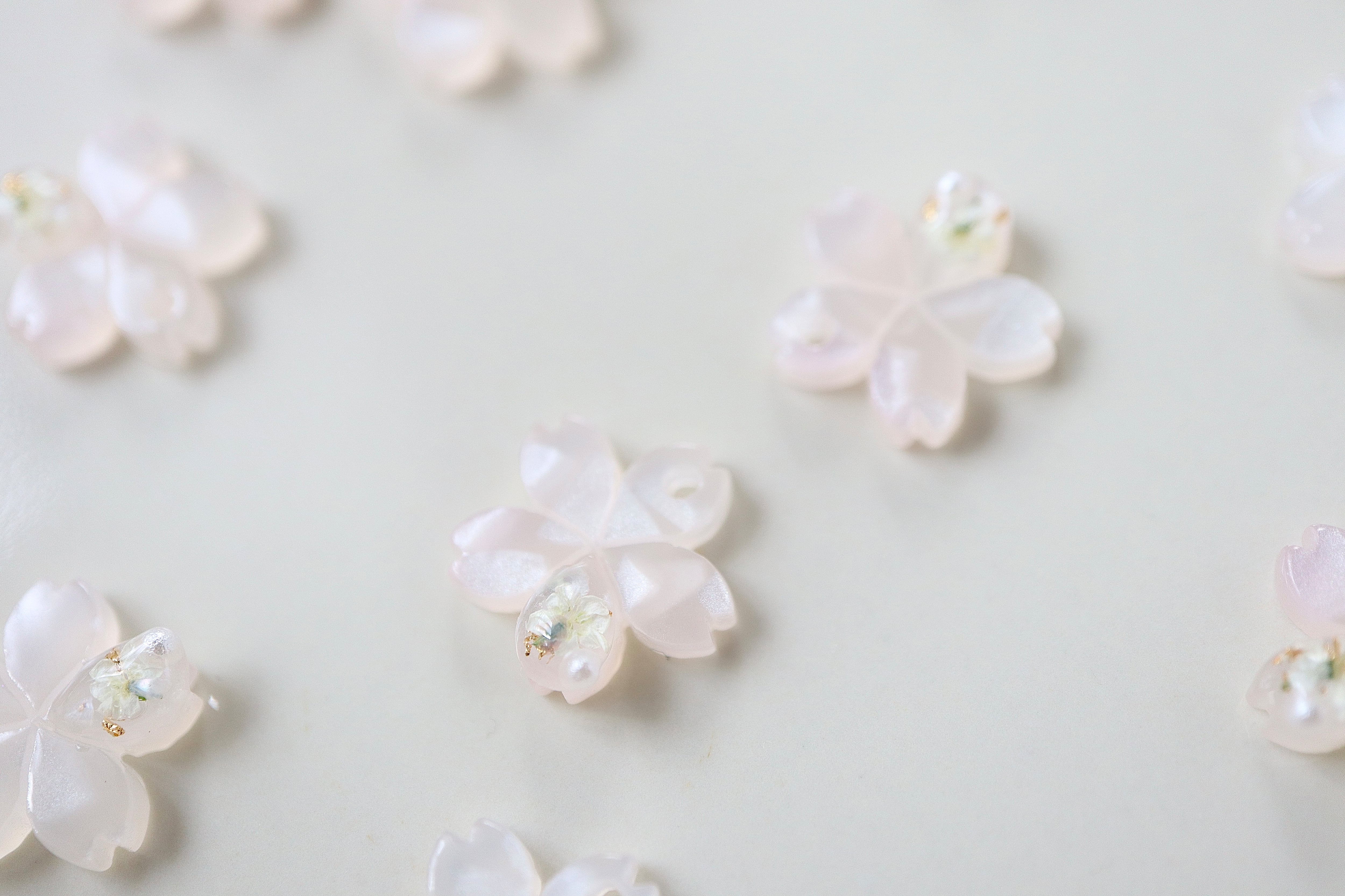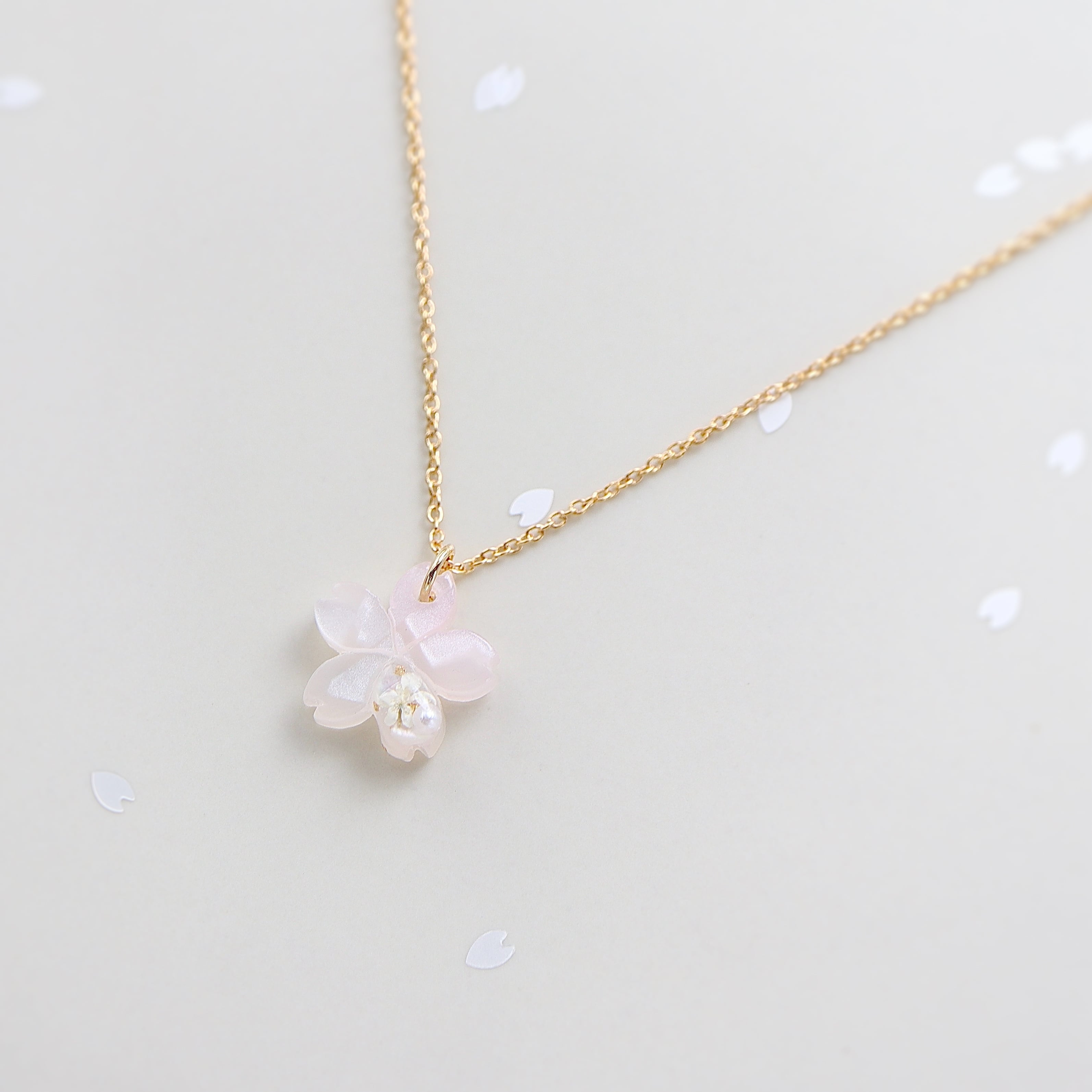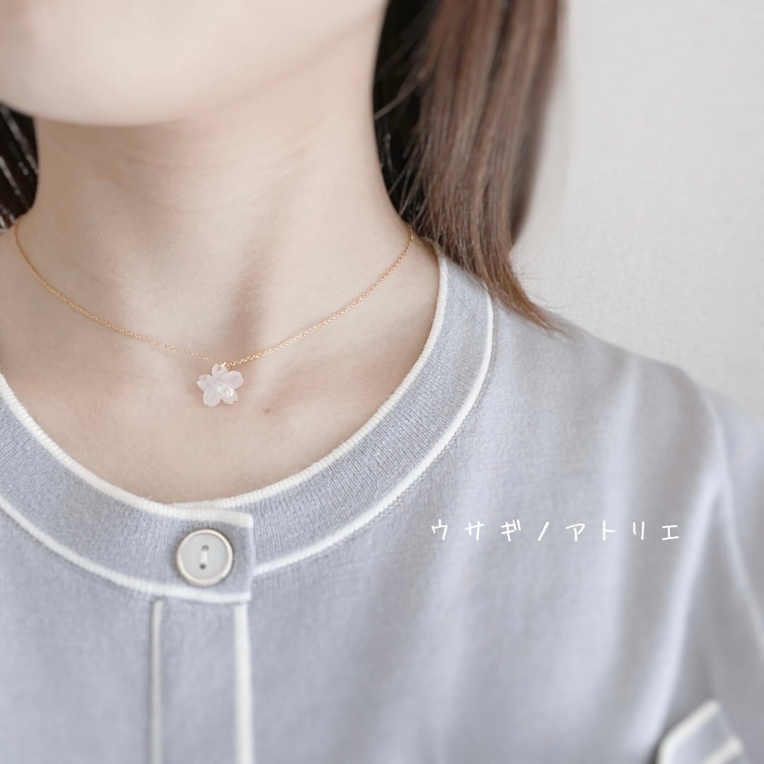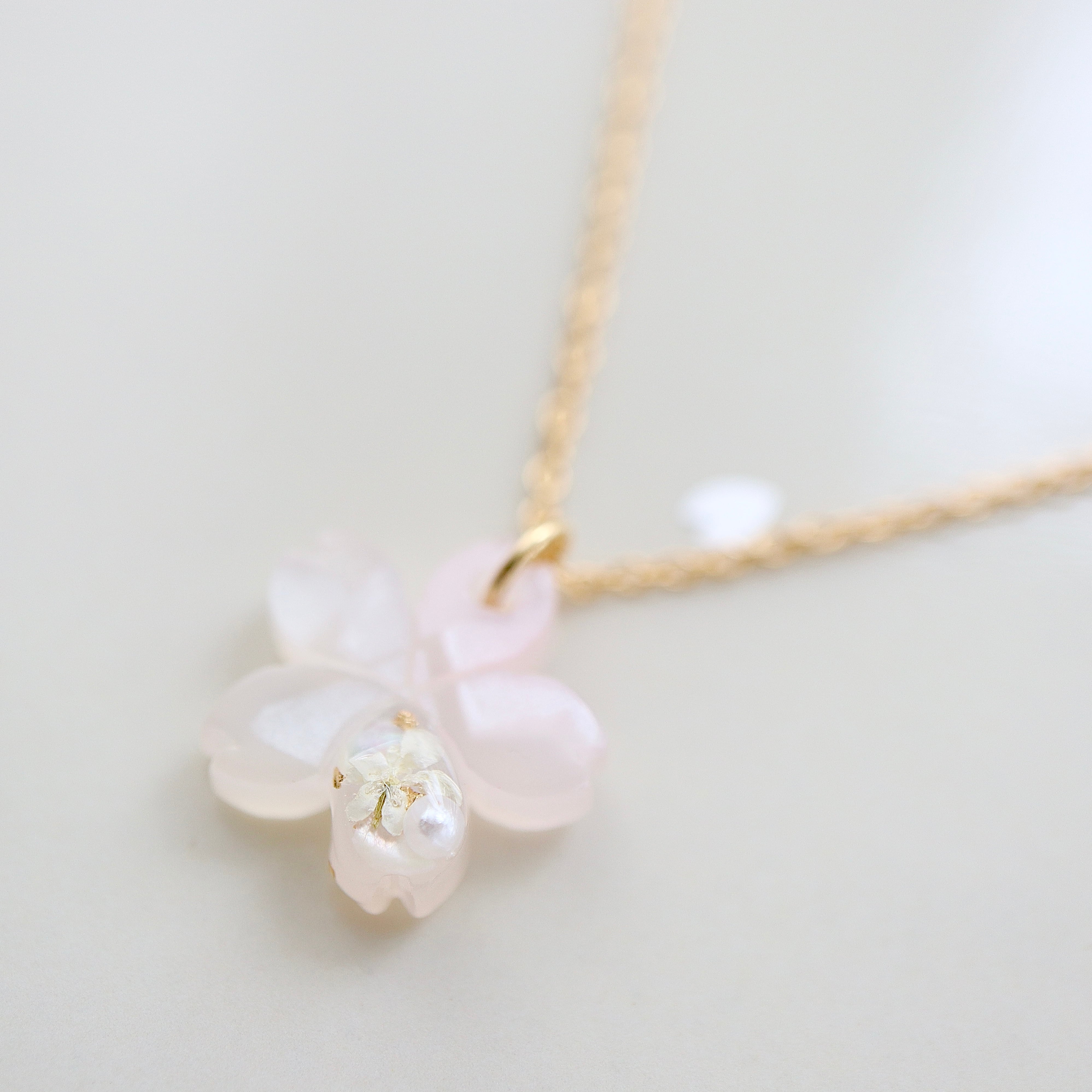 やさしい色合いの桜と中に入っている小さな本物のお花が、首元にふんわりと咲きます。